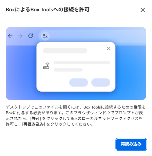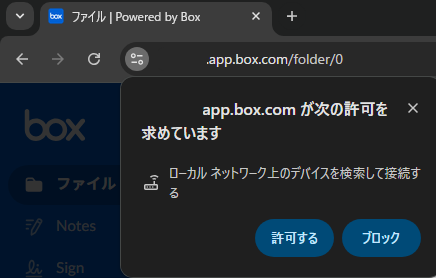 この影響によりブラウザでBoxを開いた場合に「Box Toolsへの接続許可」を求めるポップアップが表示されるようになりました。