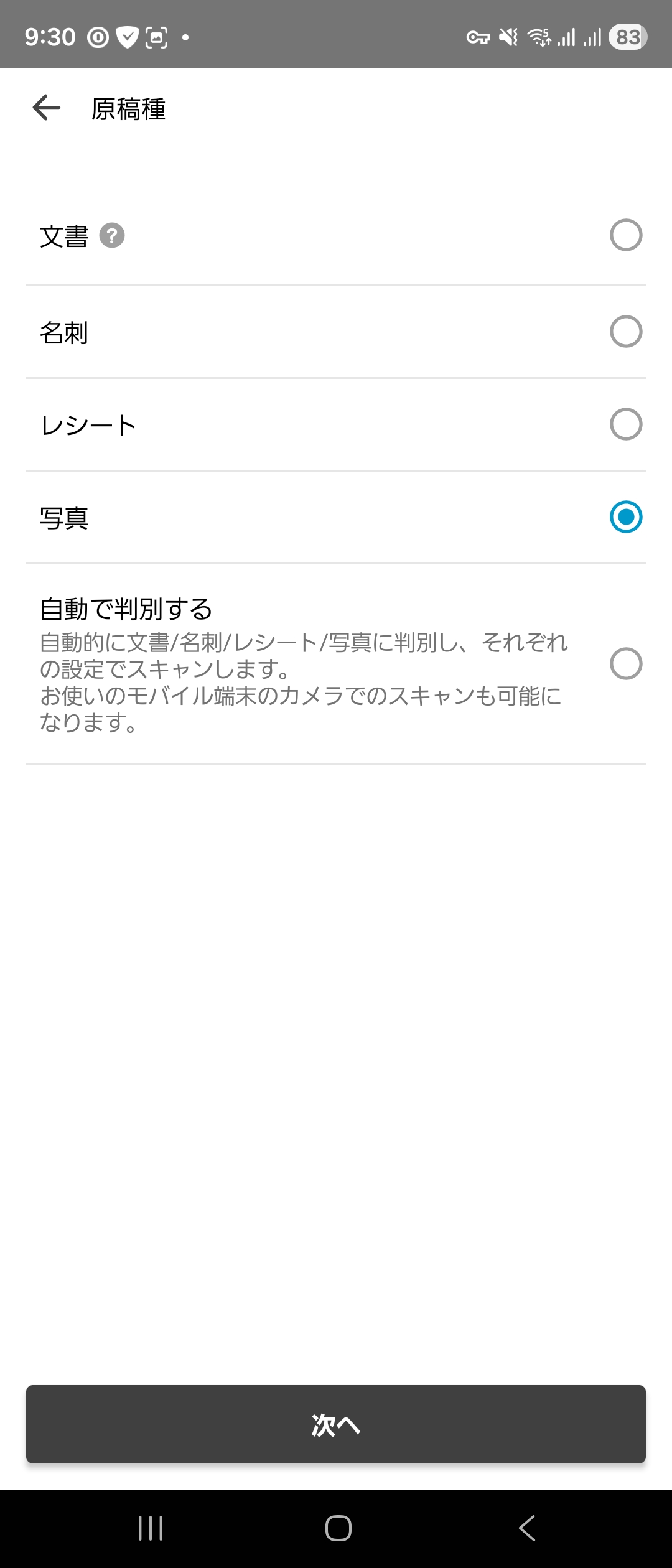 原稿の種類を選択します。ここでは写真をスキャンする設定にしています。