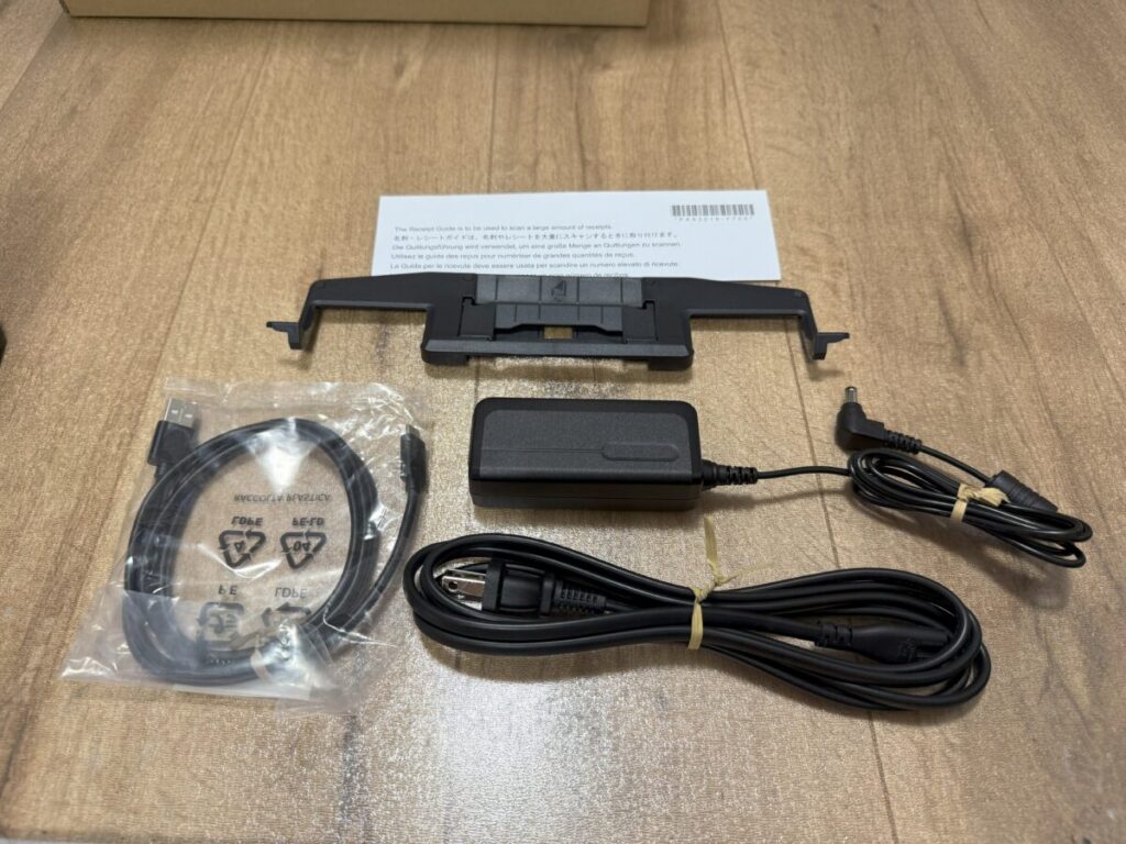 電源コード、PCと接続するためのUSBケーブル、レシートガイドが付属しています。
