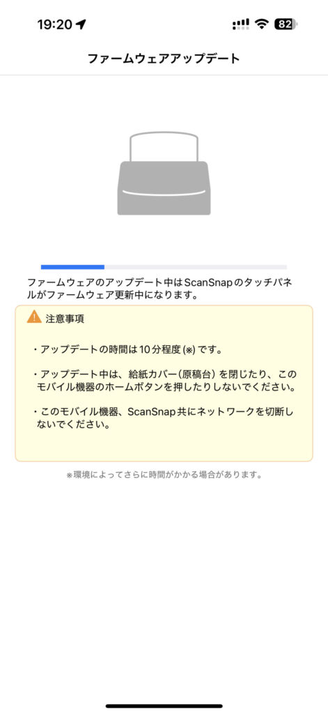 途中を省いていますが、スマホのアプリ「ScanSnap Home」と連携して無線LANの接続やスキャナー本体のファームウェアアップデートを実施します。